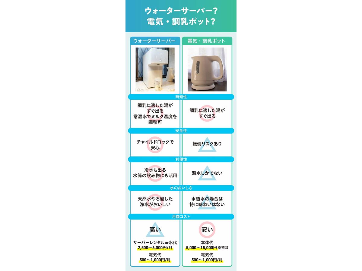 ただ、筆者もそのひとりですが、基本的にウォーターサーバーは一度使うとその便利さにやめられなくなります。また赤ちゃんのミルク用にしか使わないと思っていても、子どもが大きくなり保育園や幼稚園に入ると毎日水筒に入れたお茶を持って行くようになります。毎日のお茶作りに、食べ盛りの子どもがカップスープやラーメンを食べるのに、ウォーターサーバーの温水がかなり役立ちました。自分や家族のライフスタイルを長期的に見て、契約期間を考えることをおすすめします。