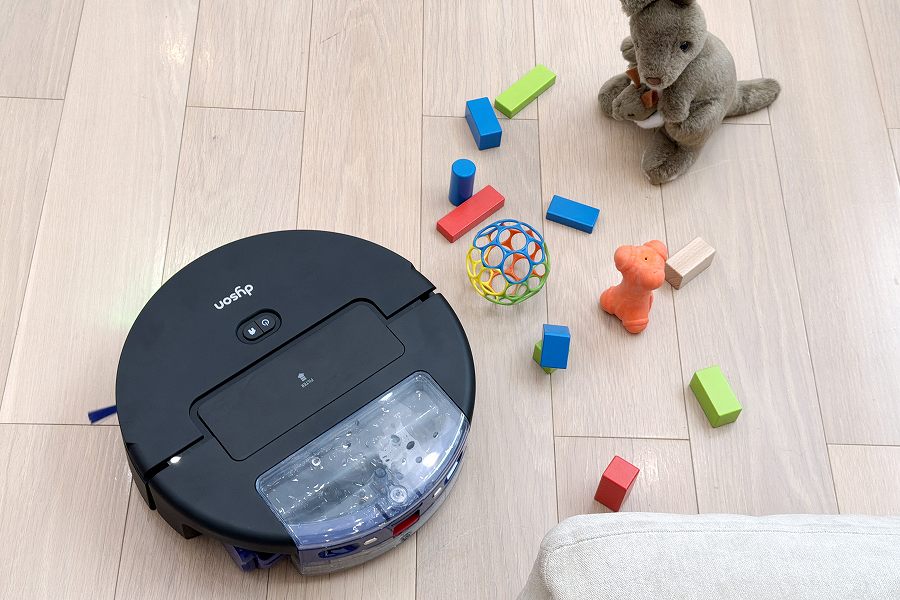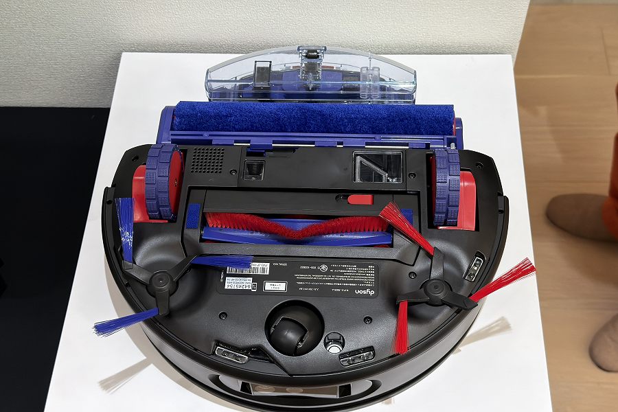 本体の見た目は、従来機の“ダイソンぽさ”が抜け、割と一般的なロボット掃除機寄りの印象。水拭き用の水タンクがクリア仕様なのがユニークです