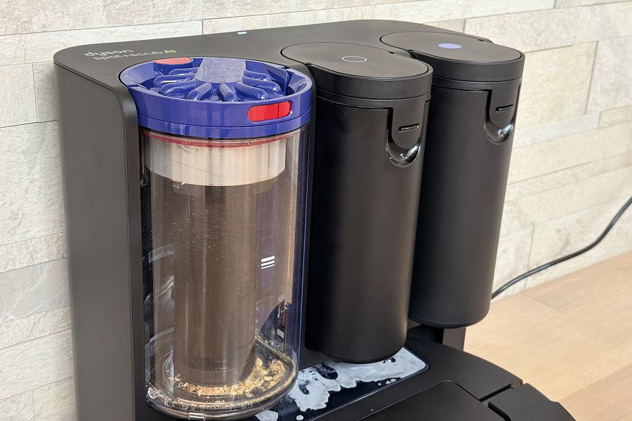 見ただけで「あ、ダイソンだ」と認識できる、おなじみの「ルートサイクロン」搭載のダストビン。ここにロボット掃除機が集めてきたゴミが集まります
