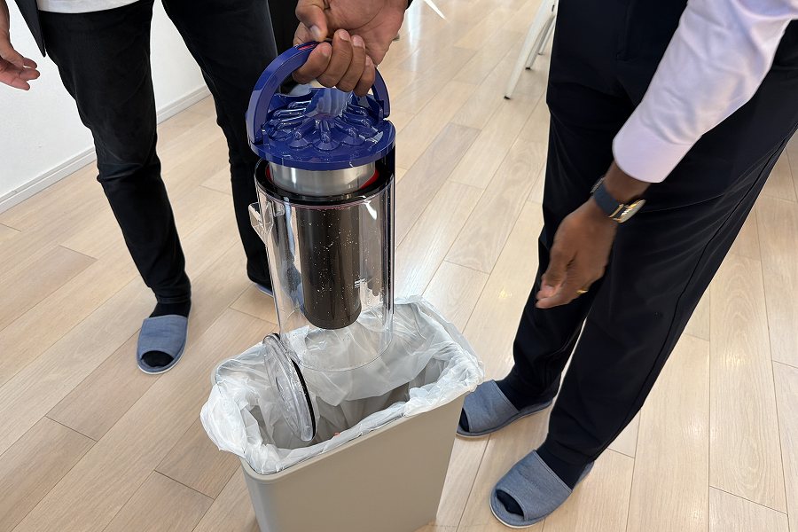 ダストビンにゴミがいっぱいまで溜まったら、上部のハンドルをつかんでドックから分離。ゴミ箱の上でレバーを引くと底がパカッと開いてゴミが落ちるという、ダイソンの掃除機としてはおなじみの仕組みを採用しています。