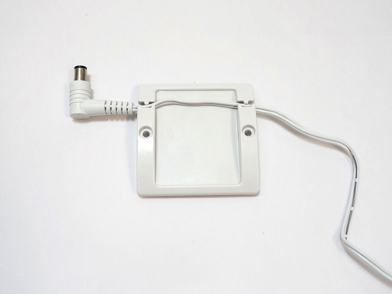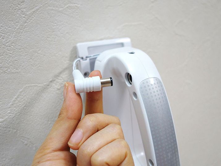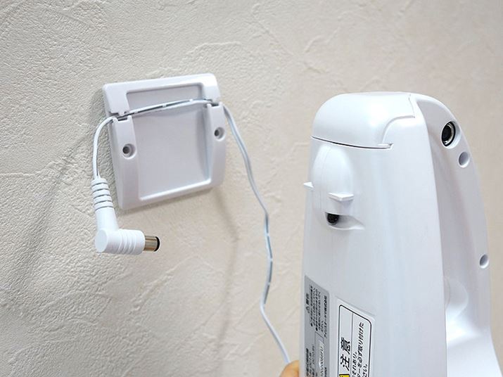 IC-SLDC1は、本体単体では自立しませんが、ハンドル部分に磁石が入っており「壁置きパーツ」(写真上)や冷蔵庫などの磁性があるものに近づけるとピタッとくっつけておくことができます。壁置きパーツは、約6.5cm四方の大きさで、裏面の粘着テープ(繰り返し使用可能)か木ネジなどで壁に付けられるようになっています。壁置きパーツには電源コードを繋ぐことができるので、プラグ先を本体の差し込み口の近くに配置できて便利でした。壁に貼り付けた際に余ったコードを巻き付けておけるようになっている仕様が◎