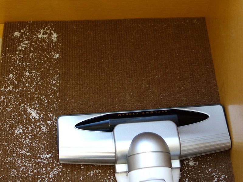 また、回転ブラシがないことで一番うれしかったのが、髪の毛が絡まらないこと。筆者宅が今まで使用していた掃除機は回転ブラシ式でしたが、これは長い毛が一定以上絡まるとブラシが停止してしまいます。そのため、掃除中に何度も回転ブラシに絡まった毛をハサミで切る必要があり、かなりのストレスでした。さらに、回転ブラシの場合はヘッド内のローラー幅しかブラシが届きません。しかし、サイクロンストリームは、ヘッドギリギリまで強力にゴミを吸引してくれるのも特徴です。とはいえ、物理的にゴミを引きはがすわけではないので、カーペットを掃除する場合は回転ブラシ式に比べて劣るように感じました。とくに、カーペットの毛に絡みついているようなゴミは苦手なようです。逆に、フローリングのゴミはほぼすべて吸い取ったので、フローリング床の掃除を考えているならば、かなり満足のいくパフォーマンスを発揮してくれるはずです。