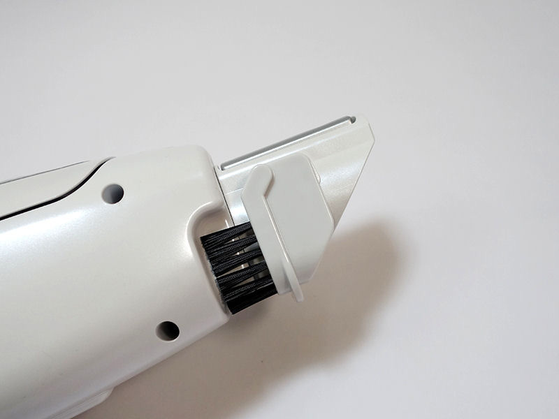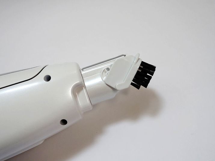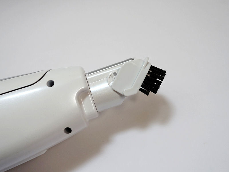また、本体の先にはブラシが格納されており、使用したいときに90度まわすだけで装着できるのも便利でした。パーツが分離していないので、使用したいときにすぐ使えるというだけでなく、紛失の心配がないのがいいですね。