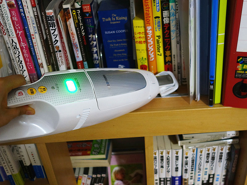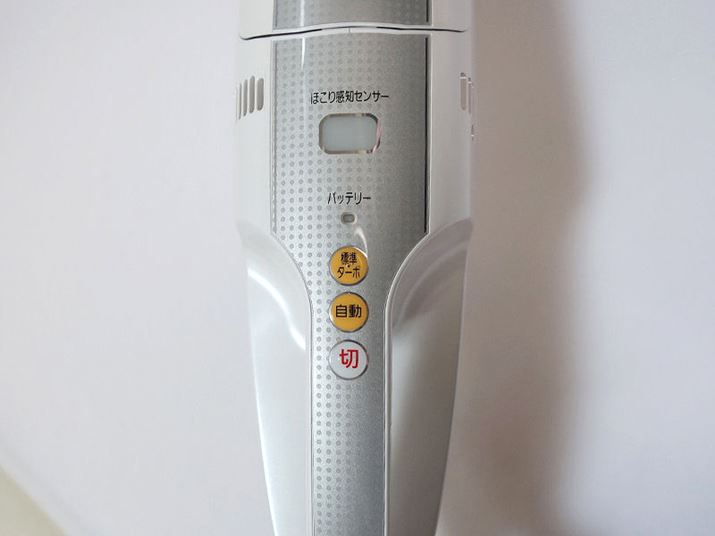 実際に使用してみると、バッテリーや吸引力といった基本性能以外にも使いやすい機能が多数ありました。とくに嬉しかったのは、コンパクトな掃除機なのにほこり感知センサーを搭載していること。ゴミが残っている場所では、手元のセンサーが赤色に発光、ゴミを吸い取ったあとは緑色に変わります。また、自動運転モードで掃除している場合は、ゴミセンサー反応時はターボ、ゴミを感知していないと標準モードで吸引するので、効率よくバッテリーを使えます。