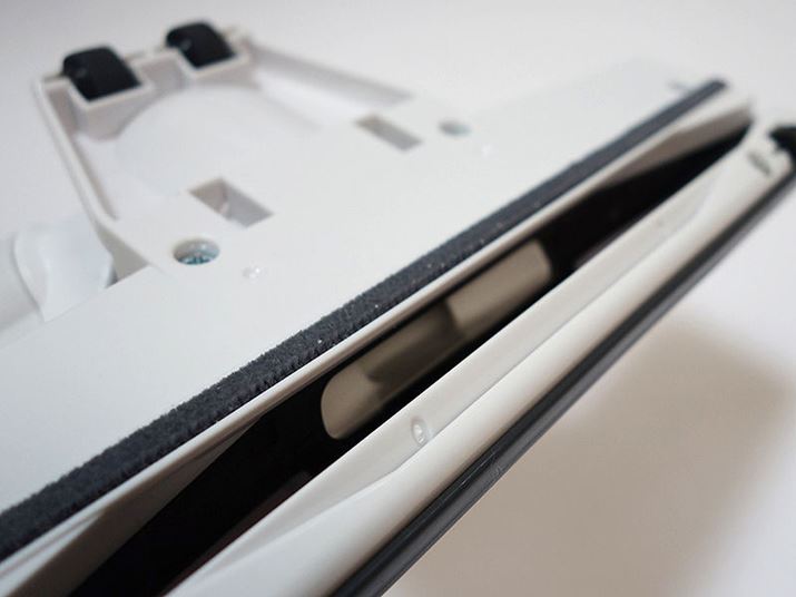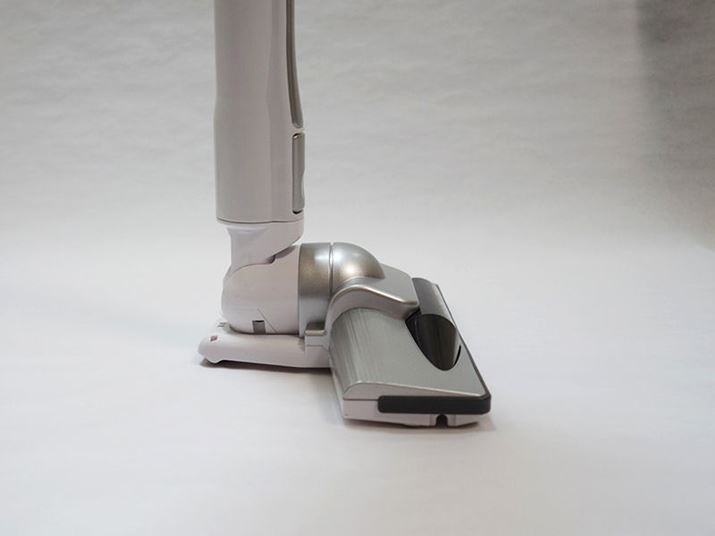 ヘッドを裏からみると、中が空洞になっているのがわかります。ここに高速気流を発生させ、強力にゴミを吸い取ります。回転ブラシがない分ヘッドが軽く、取り扱いもラクです