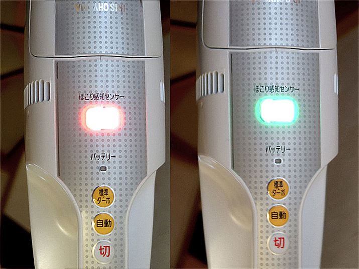本体手元にある「ほこり感知センサー」。ほこりがある場所では赤色、ほこりが除去されると緑に光ります。ほこり量に合わせて吸引力を調整する「自動モード」は、省エネにもなりますね