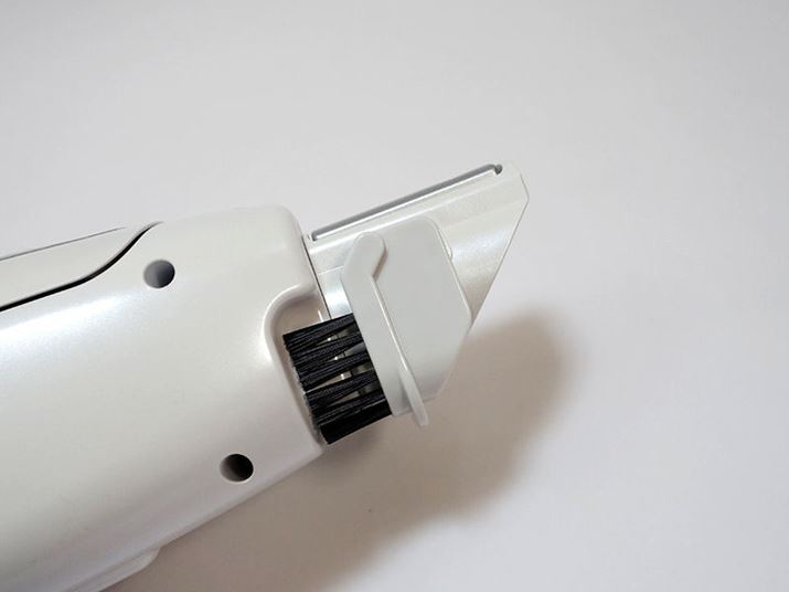 本体先にはブラシが格納されており、90度回転させることでブラシが使用できるようになります。ブラシサイズは、約5×3cmで、細かな場所のゴミをサッと掃除するのに重宝します。使わないときにも本体から外す必要がないので、必要なときにいつでも使用できて便利!