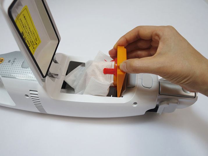 カバーボタンを押すと、紙パックごとゴミを取り出すことができます。オレンジ色の「パックホルダー」を引き出し、白い紙パックを捨てればメンテナンス終了。本体に汚れがつかないので、サイクロン式掃除機より手軽で清潔です
