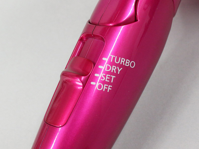 風量は「TURBO(強い風)」「DRY(やや強い風)」「SET(弱い風)」の3段階で、モード(風温)は「HOT」「温冷リズム」「COLD」「SKIN」「SCALP」の5種類から選択ができる。