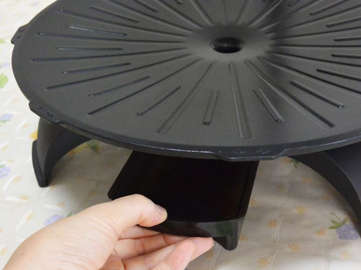 丸いプレートには、中央の穴に向けて低くなる斜度が付いている。これは、食材のムダな脂を落すための工夫。穴から落ちた脂は、「油受け皿」に溜まる。この構造は「ザイグル」も同じだが、穴の部分に支柱がない「ザイグルシンプル」のほうが手入れがしやすいかもしれない