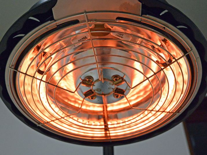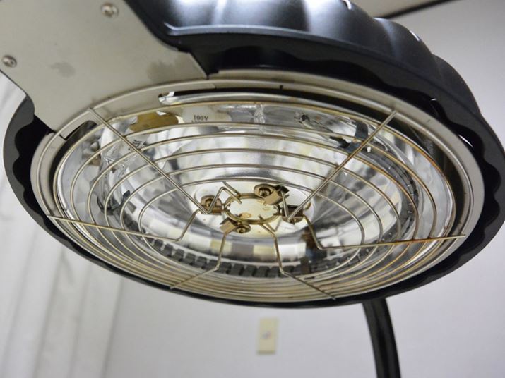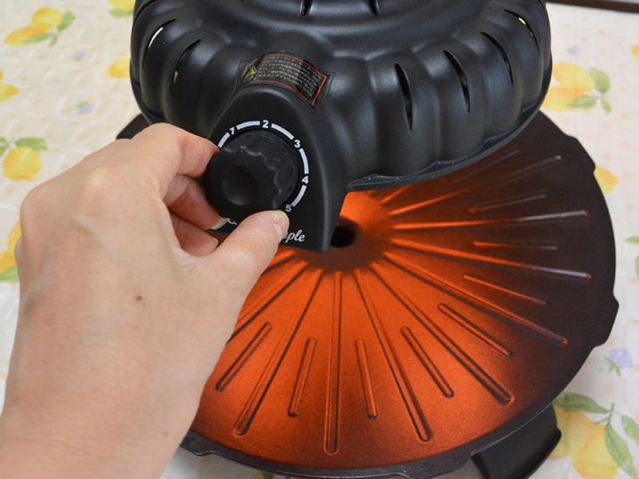 ダイヤルを回すと、カーボンヒーターが点灯。ダイヤルは「1」〜「5」で設定できるようになっているが、放射される赤外線の温度が変わるわけではない。サーモスタットが搭載されており、本体温度をもとにヒーターをON/OFFすることで加熱具合を調整。ダイヤルの数字が大きいほどヒーターがOFFになる設定温度が上がり、数字が小さいほど設定温度が下がる
