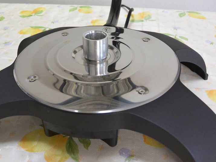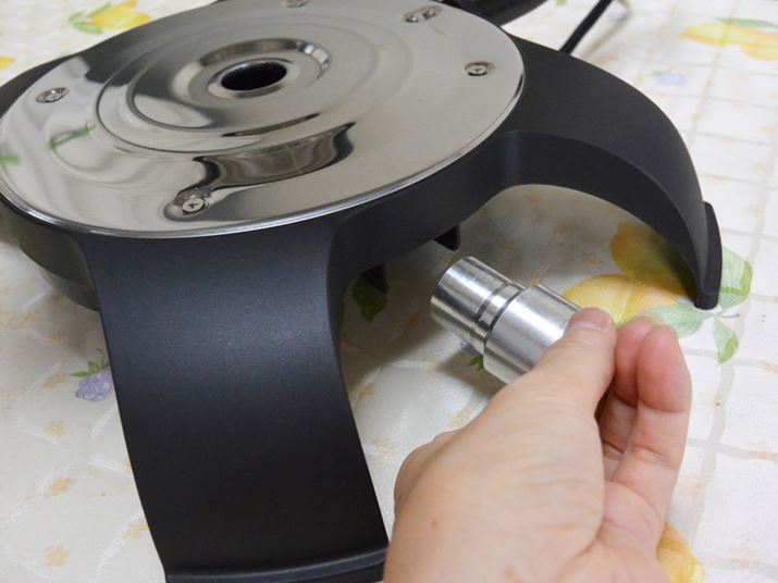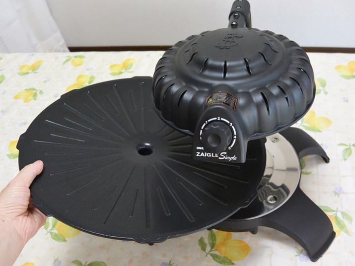 「ザイグルシンプル」には「ザイグル」のように熱源(傘の部分)の高さを調整する支柱はないが、熱源とプレートとの距離を変えるための工夫がある。それが、本体下に装着されているアダプターだ。アダプターは写真右のように、穴にセットできる