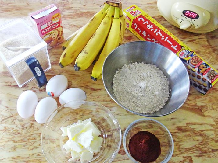 主役はバナナ。そのほか、薄力粉、ベーキングパウダー、ココア、卵、バター、砂糖、バニラエッセンスとクッキングシートを用意