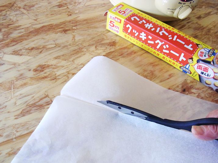 クッキングシートは、直径16cmの丸型と8×38cmの長方形に切ったものを2種類用意しておく