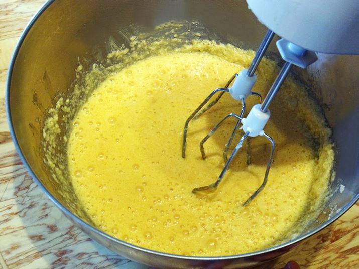 そこに、ふるいにかけておいた粉を加えて、さっくりと混ぜていく