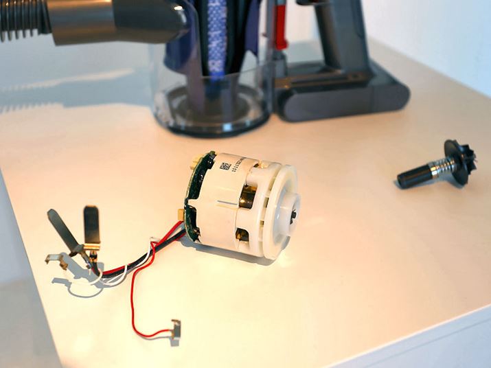 毎分最大11万回転を実現する新開発のモーター「DDM V6」。前モデルに搭載されているモーター「DDM V2」と比較し、約1.5倍のパワーを持つ。それに加え、インペラー(写真左/右側)のサイズも大型化し、より多くの空気を取り込めるようになったという