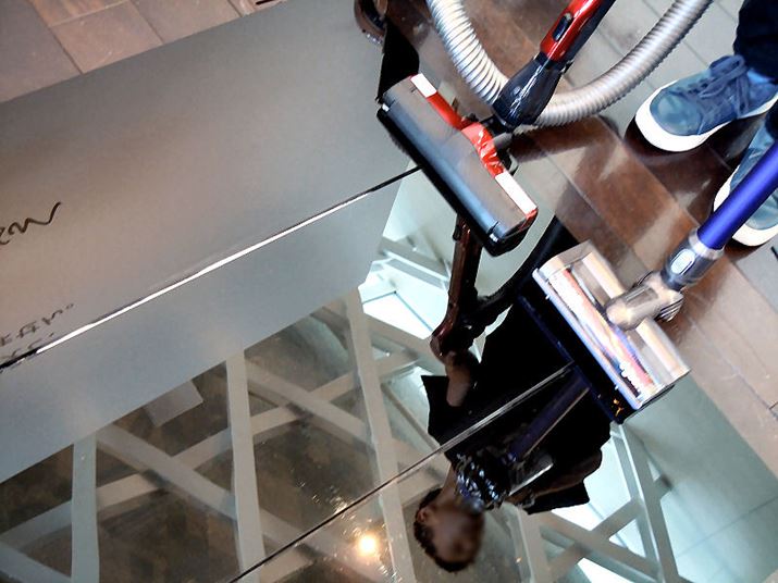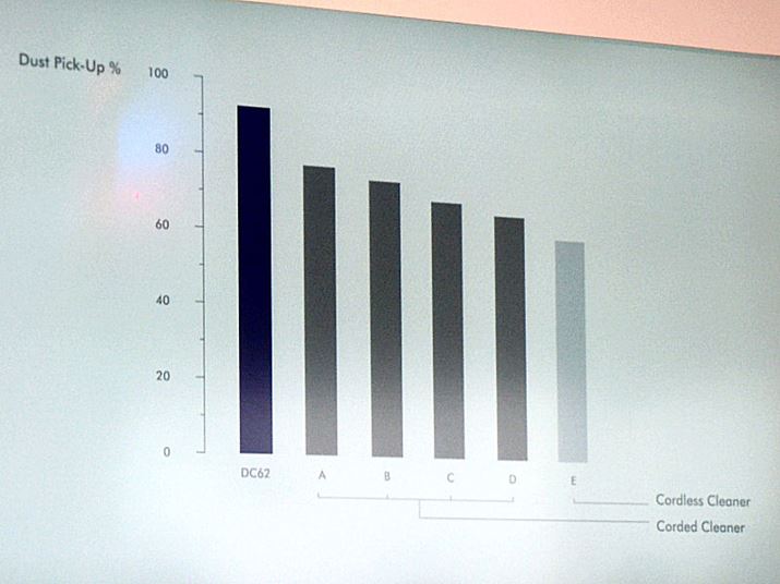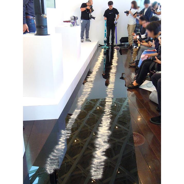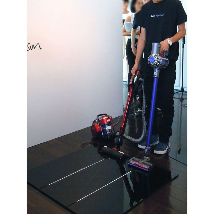 会場では、「DC62」のその性能をアピールすべく、一般的なキャニスター型掃除機とスティック型コードレス掃除機との掃除能力の比較実験も行われていた。