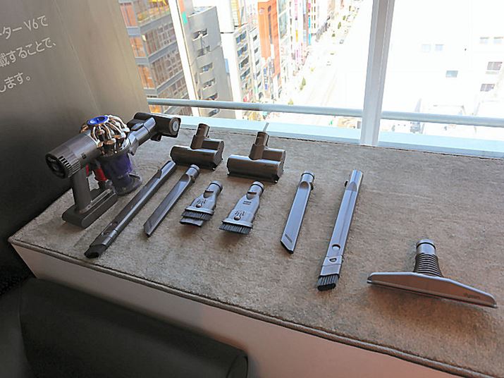 「DC62 モーターヘッド コンプリート」に付属しているツールは、「モーターヘッド」「ミニモーターヘッド」「ソフトブラシツール」「フレキシブルすき間ノズル」「すき間ノズル」「コンビネーションノズル」「フトンツール」の7種類となる
