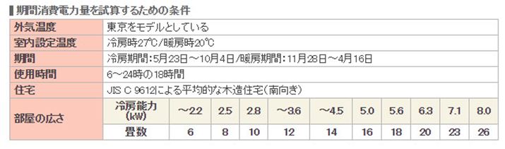 期間消費電力量とは、一定の条件(下記の表参照)を基に試算された“1年を通して冷暖房を使った時の消費電力量”で、製品紹介欄でよく目にする「目安年間電気料金」を算出する基にもなっている。カタログにはいろいろなスペックが載っているが、省エネ性能は「期間消費電力量」で確かめて問題ない。ただし、東京をモデルとして試算しているので、“東京よりも寒い/暑い地域”や“設定温度が高い/低い”など、条件が異なれば期間消費電力量も変動することを念頭に置いておこう。