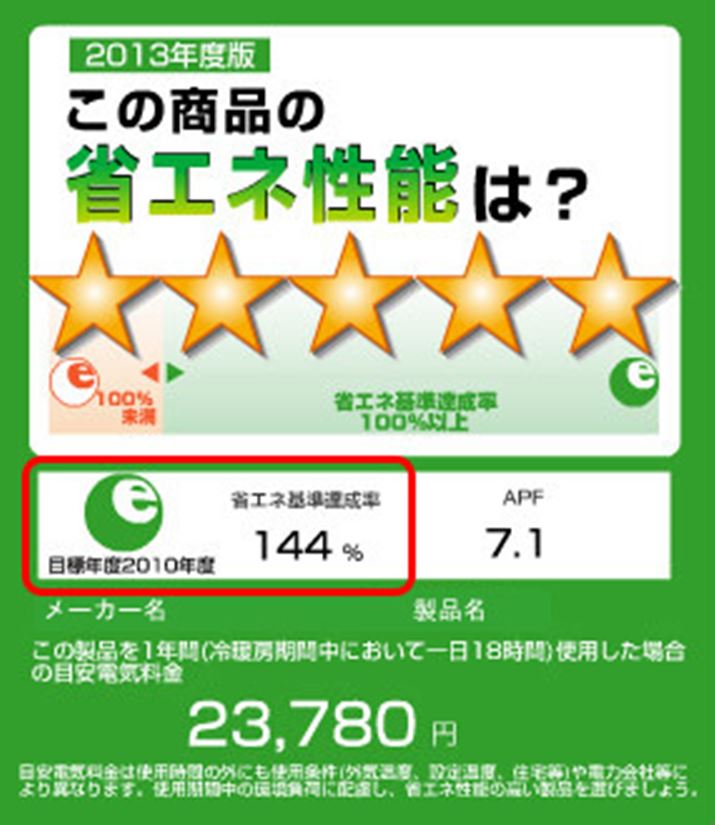 もし、見比べたいエアコンの「期間消費電力量」のJIS規格が「JIS C 9612:2013」と「JIS C 9612:2005」というふうに異なる場合、「省エネ基準達成率」を見てみるといい。省エネ基準達成率は改正前の「JIS C 9612:2005」を適用することが決められているので(2014年3月時点)、統一された表記として参考になるだろう。ここの数字が大きいほど、省エネ性能が高いということになる。