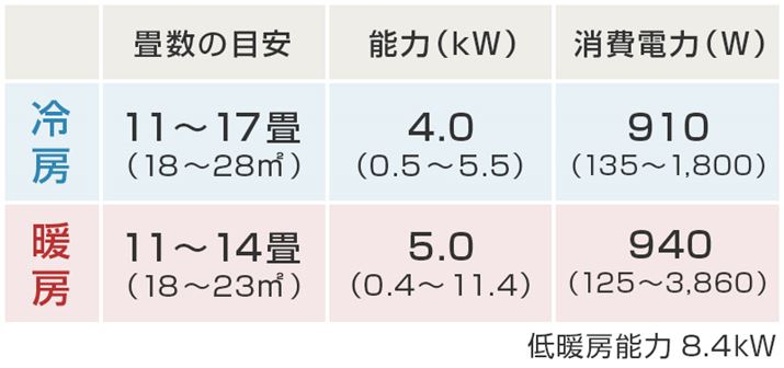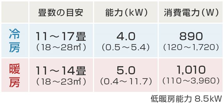 「POINT1」で解説した適用畳数が表示されているスペック欄には、「能力(kW)」も明記されている。その名のごとくエアコンの能力を表しており、数値が大きいほど広い部屋に対応可能。だが、部屋への適応は畳数を見ればいいので、「能力(kW)」でチェックすべきは「4.0」などの数値の下にある( )の中だ。これは能力の幅で、最小値がより小さいエアコンのほうが細やかな運転ができ、最大値がより大きいもののほうがパワフルな運転ができるということになる。