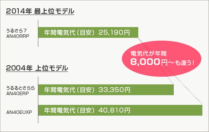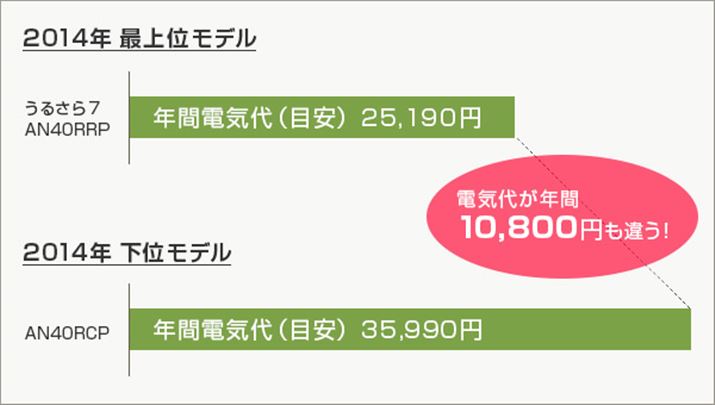 ※上2つのグラフにある年間電気代は環境省が提供するデータをもとにしているため、2013年4月に改正されたJIS規格による試算とは異なる。改正後の年間電気代は、最上位モデル「AN40RRP」が約24,130円、下位モデル「AN40RCP」が33,970円