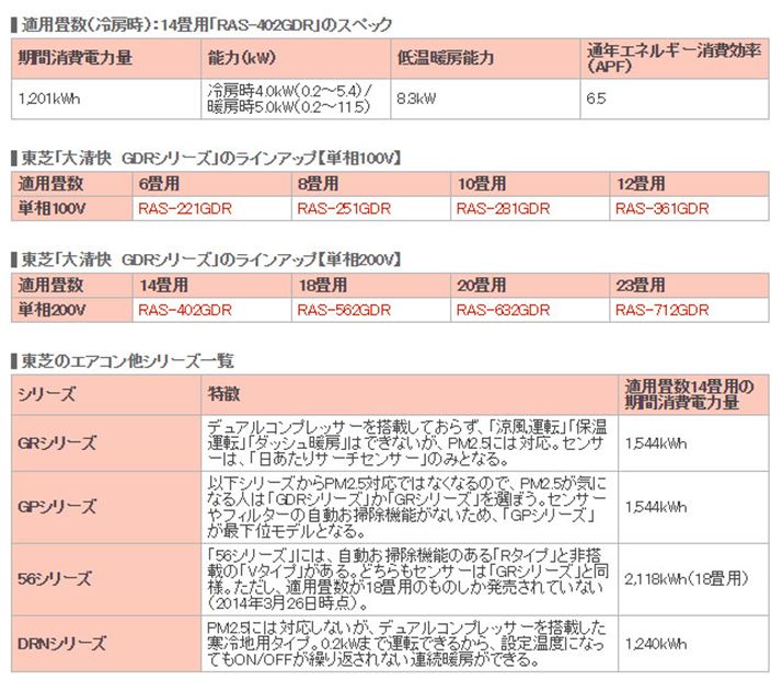 冷房時、暖房時ともに能力(kW)の最小値が「0.2」となっており、今回紹介した7モデルの中で一番小さな数値となった。能力の最小値が小さいほど細やかな運転ができることを示しているのだが、それを実現できたのは東芝独自の技術「デュアルコンプレッサー」にある。コンプレッサーの内部に2つのシリンダーを搭載しており、大きな能力が必要な時は2つ、小さな能力でいい時には1つと使い分けることで、ムダな電力を使わず温度変化の少ない運転を実現。この働きを利用し、消費電力約55Wで冷房や暖房ができる「涼風運転」「保温運転」も備えている。ただし、控えめに冷やすor暖める程度なので、外気温が低めの夏の日や春先の肌寒い時期に役立つモードと言えるだろう。
