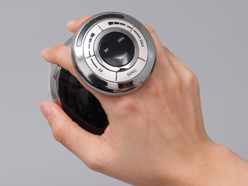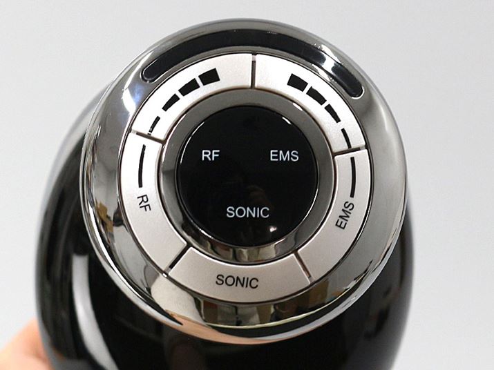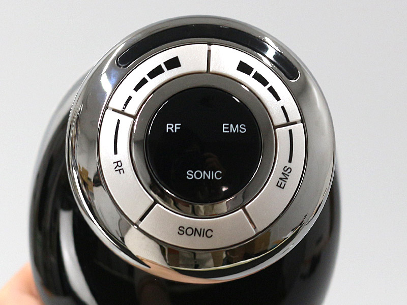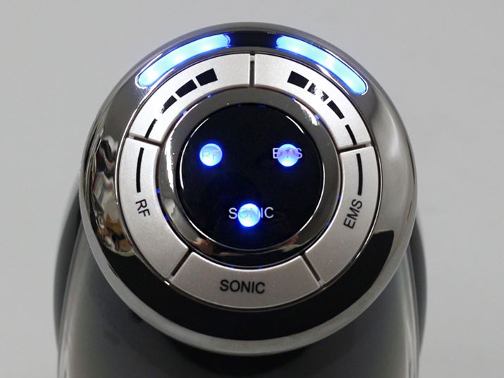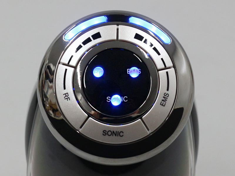 操作部。SONIC(超音波)、RF(ラジオ波)、EMSボタンのほか、RF(ラジオ波)とEMSのレベル調整ボタンが配置されています