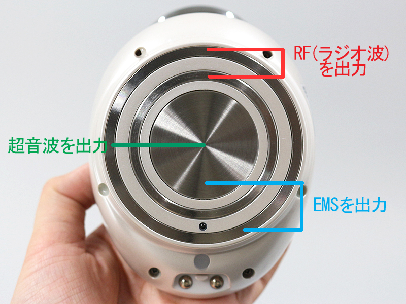 本体裏の電極ヘッド。超音波、RF(ラジオ波)、EMSはそれぞれ図の部分から発せられます