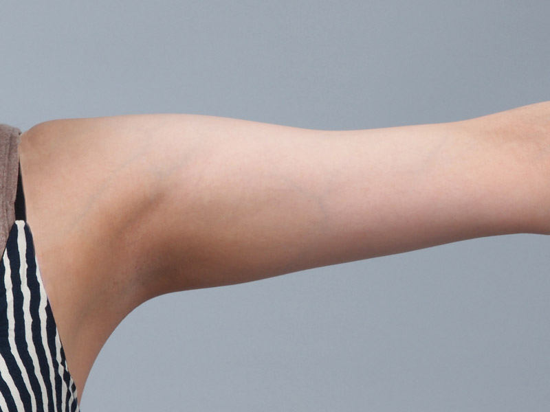 電極ヘッドを肌に垂直に当てて、すべらせるようにケアします。二の腕の場合はひじから肩に向かって流すように行いましょう。すべらせる速度の目安は、1秒間に約5cm。今回は、とくにたるみの気になる内側部分を念入りにケアしました