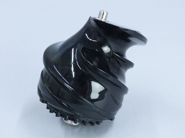 「ウルテム」という耐熱性、耐久性、耐薬品性にすぐれた樹脂製のスクリュー。このスクリューを用いて石臼圧縮式で搾汁することで、摩擦熱による栄養素の損失を最小限に抑えることができるという