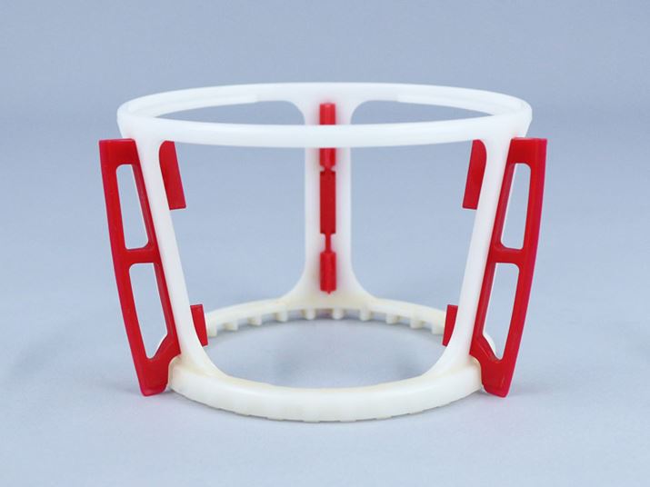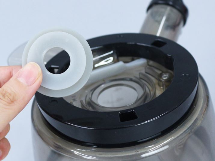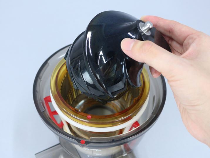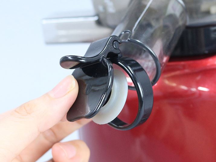 抽出口に取り付けるスマートキャップ。スマートキャップを閉めて搾汁すればドラム内でミックスジュースが作れたり、泡が出やすい材料でジュースを搾る際も、泡立ちを抑えることができる