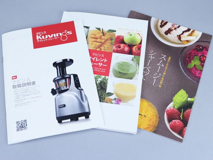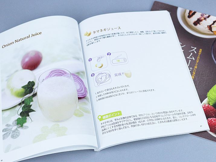 取扱説明書のほかに、ジュース用、スムージー・シャーベット用のレシピブックがそれぞれ付属。ジュースのレシピは95種類と豊富で、中には「たまねぎジュース」「ピーマンジュース」(!)などなじみのないレシピも