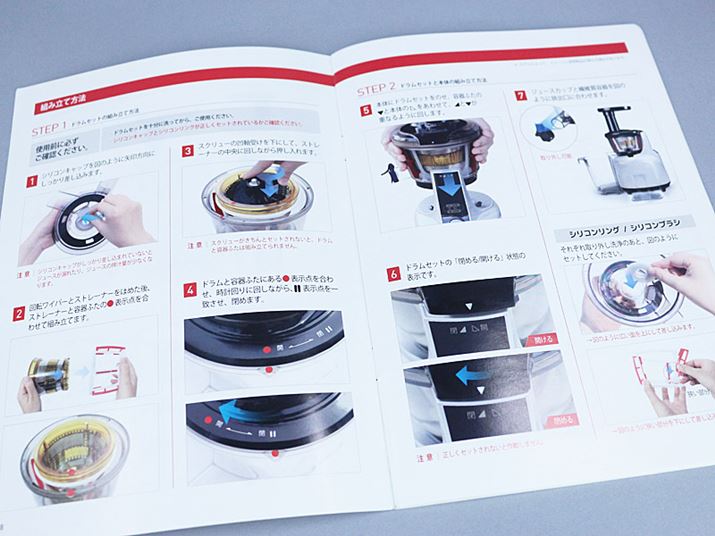 ジュース用のストレーナーを使用する場合のセット方法からお手入れ方法まで、写真付きでわかりやすく記載されている