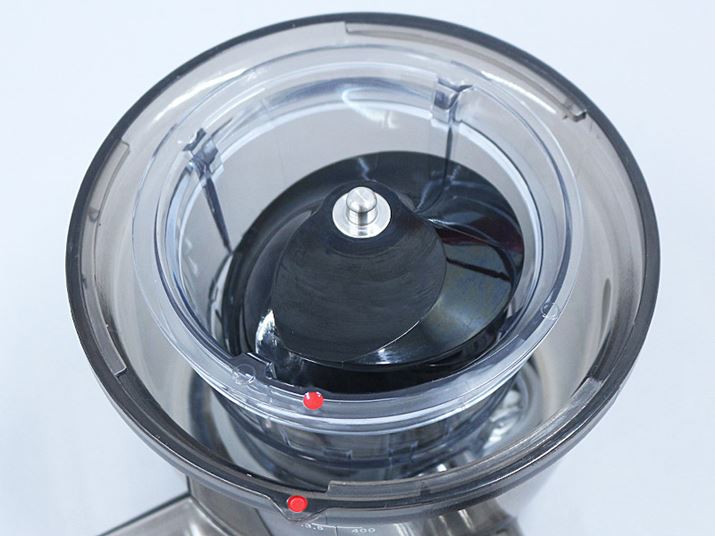 “しゃりしゃり……ごりごり……”と搾られていく様子が見ていて気持ちいい。動作音は40〜50dBと、ブレンダーのようにうるさくは感じない。投入したそばからどんどん搾り、りんご1個、にんじん1本であれば1分強で搾ることができた