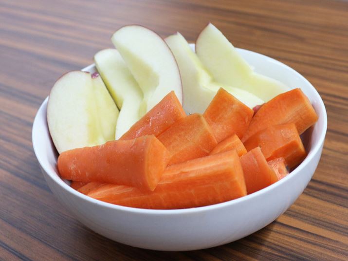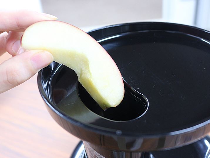 まずは、にんじんとりんごのジュースを搾ってみよう。動作音やスピード、ジュースの味はどうだろうか。下準備は、材料を洗って種を除いてカットするだけ。薄い皮は付いたままでOKだ。なお、氷の使用は不可。