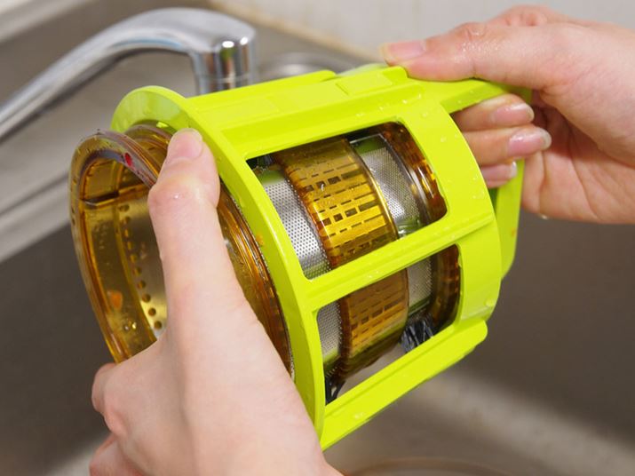 にんじんとりんごを搾った後のジュース用ストレーナー。網目に繊維が挟まって、洗うのが面倒そうだが……