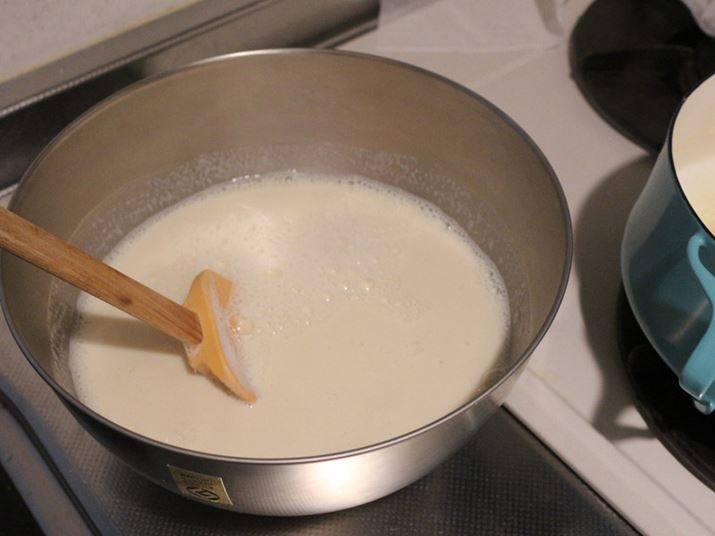 レシピによると、豆乳を鍋で温めた後、にがりを混ぜると少しずつ固まってくる……はずだが、レシピ通りの分量(5ml)では固まらなかったため、にがりを少しずつ足していき、最終的にレシピのおよそ5倍ほどの量のにがりを入れたところでようやく固まり出した