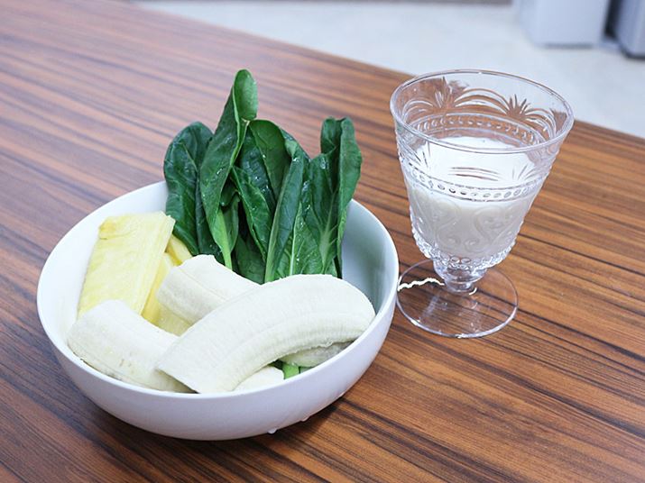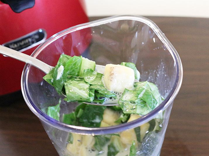 小松菜、バナナ、パイナップル、豆乳の順に投入する