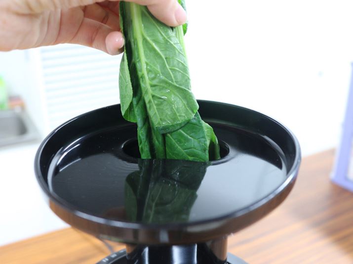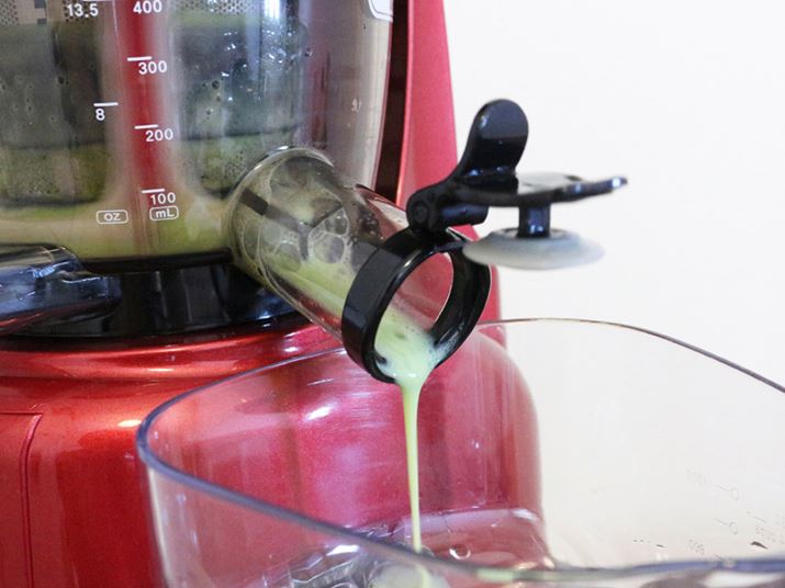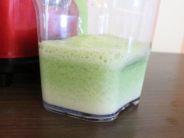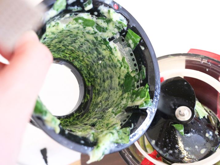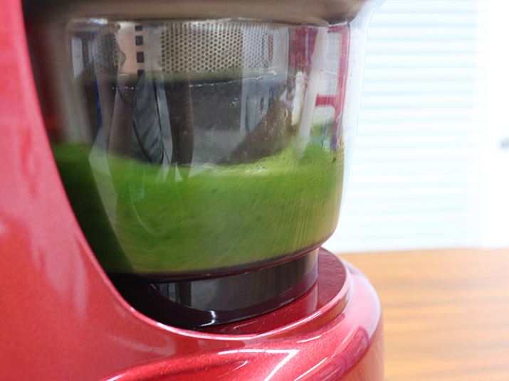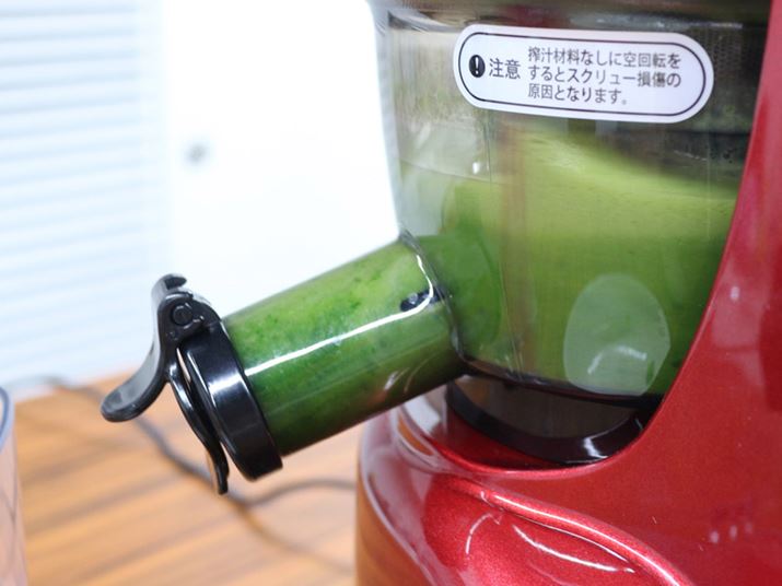 先に入れた小松菜が抽出口にたまりムラができているので、気をつけながら本体ごと傾けるなどして、中身を混ぜておく