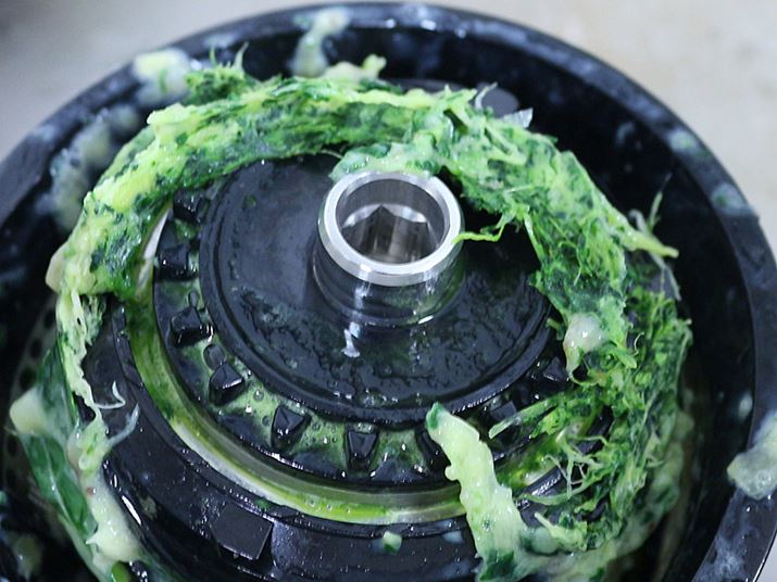 スクリューには、やはりバナナの果肉や小松菜の繊維がたっぷり残っている。野菜や果物の繊維も丸ごと摂れるのがスムージーの魅力と心得る筆者は、これをスムージーと呼んでよいものか悩んだ……。残念ながら、“繊維もまるごと飲む”というタイプのスムージーを作るのには不向きなようだ
