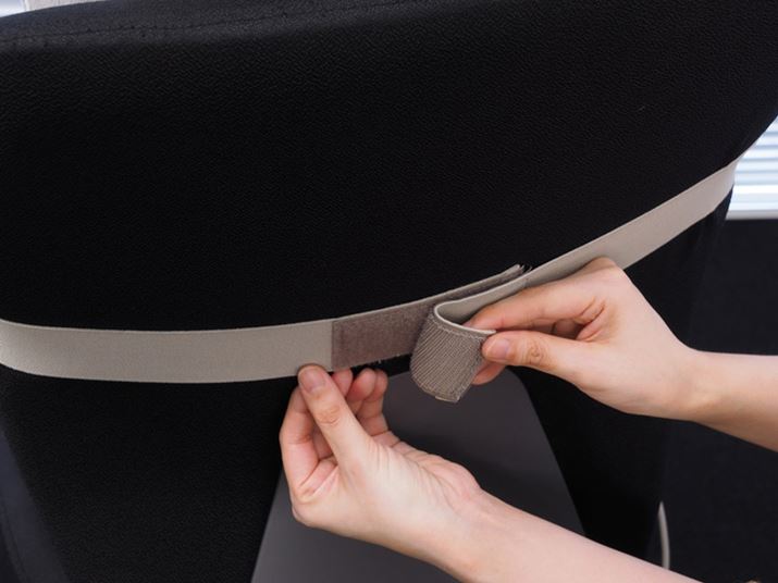 シートをイスに置いたら、ゴム製の固定ベルトをイスの背もたれに巻きつけます。写真で使用しているイスの背もたれの外周は約95cm。それでもベルトの長さはぎりぎりだったので、車のシートなど外周の大きいイスにつける時は、固定ベルトは使用できないかもしれません