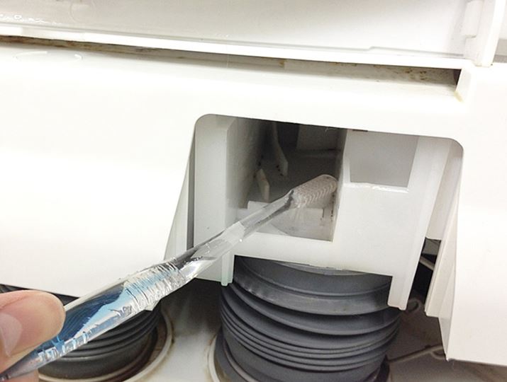洗剤、柔軟剤投入口には、固まった洗剤や柔軟剤がこびりついています。本体から取り外して洗いましょう