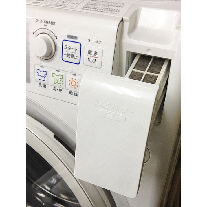 ドラム式や乾燥機能のついた縦型洗濯機の乾燥フィルター。掃除機でほこりを吸うのもよいですが、水の中でこするとよりよくとれます