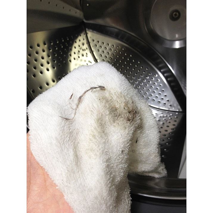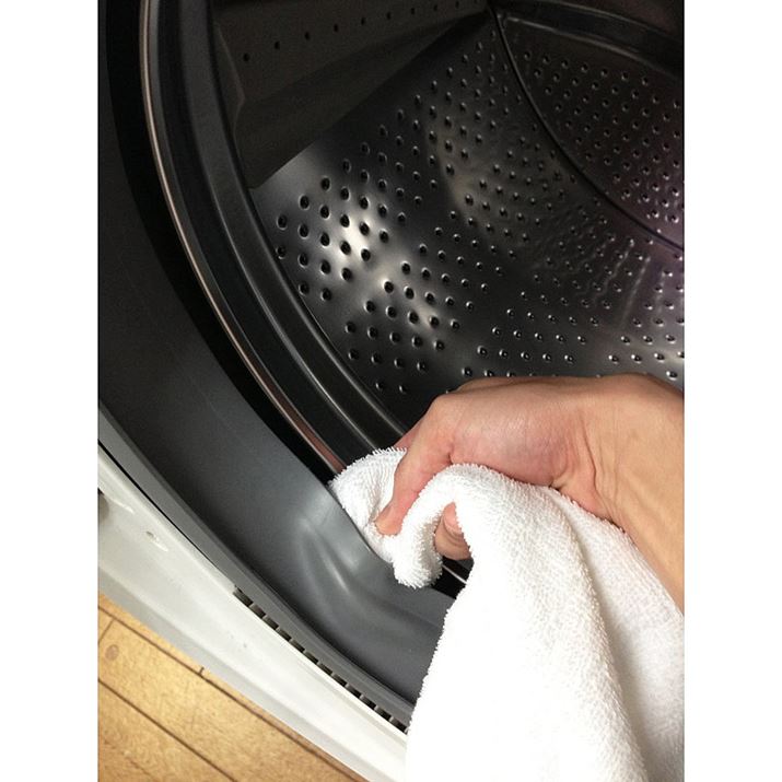 パッキンの内側、フタの内側など洗濯中に陰になる場所は、糸ほこりや洗剤カス、洗剤こぼしなどが蓄積して意外と汚れている場所。ここに汚れがあると、洗濯物に汚れやクズが付く可能性があります。タオルやティッシュを手に巻き付け、汚れをごっそり拭き取りましょう。 タオルやティッシュで届かない部分は、歯ブラシなどでこすって汚れを落としてもOK。ドラム式の場合はこのパッキンの内側に汚れや糸くずがたまるので、しっかり裏側も拭きましょう。洗剤カスが固まっている時は、お湯をかけてこすると効果的。あまり熱いと洗濯機が傷む可能性があるので、60℃くらいまでのお湯にしましょう。