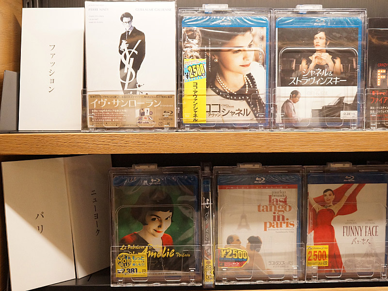 DVDソフト販売スペースには、コンシェルジュが映像の美しさにこだわってセレクトした映画DVDが、テーマ別に分類されて並んでいる