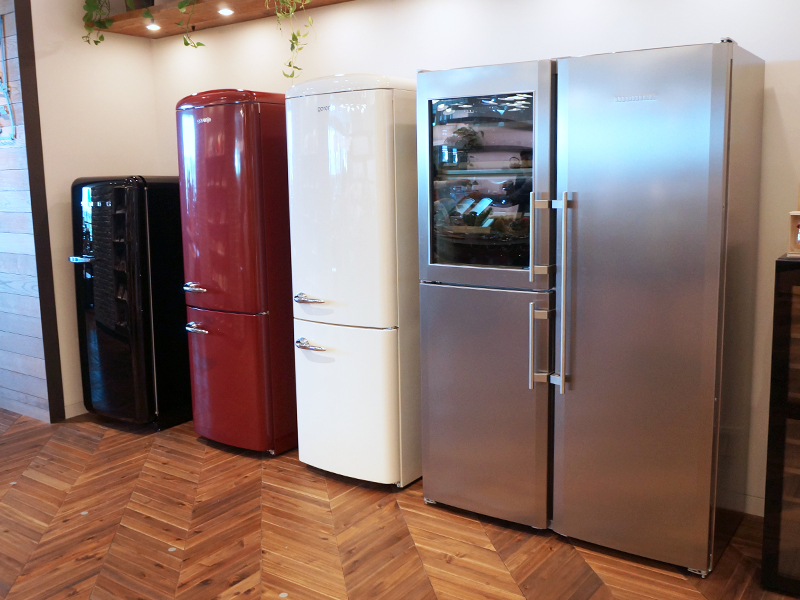 業務用の冷蔵庫のようだが、ドイツのラグジュアリー家電ブランド「リープヘル」のワインキャビネット付き冷凍冷蔵庫だ(写真右)。ここに来なければ知ることもなかった製品と出会うことも多い