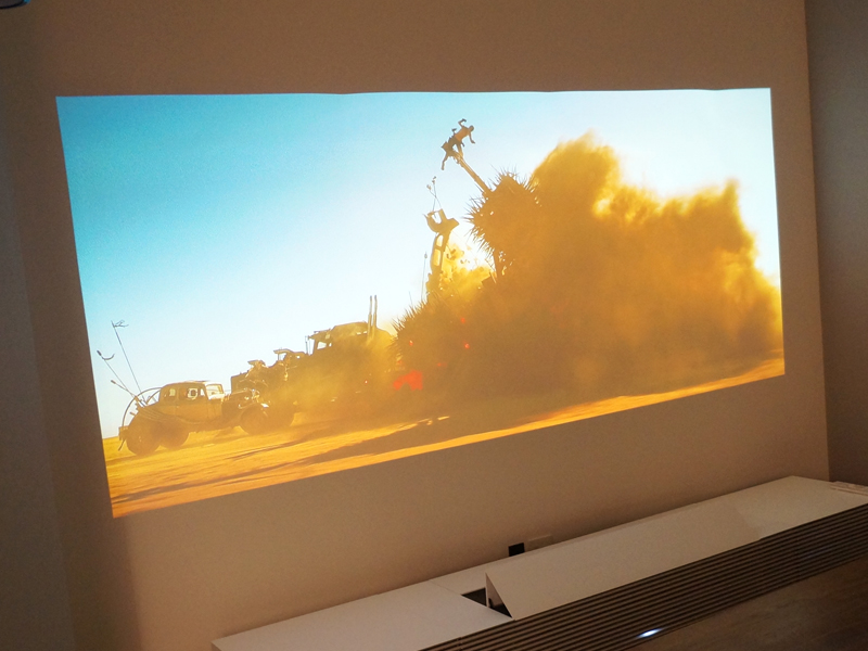 カーブドTVと4K短焦点プロジェクター。湾曲ディスプレイによって、より臨場感あふれる映像が楽しめるLGの4K有機ELテレビ 65EG9600(写真上)。至近距離からの投写でも大画面表示できるため、狭い部屋でもプロジェクターが利用可能になるソニーの4K短焦点プロジェクター(写真下)