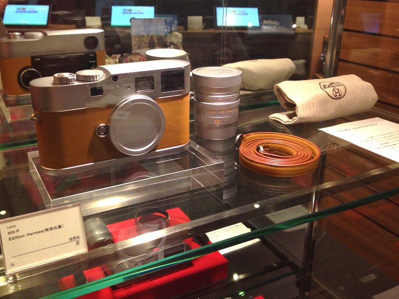 特別展示の稀少モデル。ライカ「M9-P エルメスエディション」。特別展示品のため販売はしていない。このほかにも、ハッセルブラッドのレトロキットなどマニア必見のモデルも