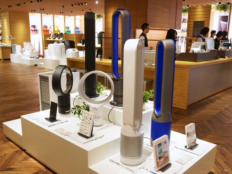 オブジェのようなディスプレイ。メーカーによっては、まとめて展示することで世界観が生まれるディスプレイに。写真はダイソンの扇風機や空気清浄機